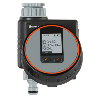 El programador de riego Flex de Gardena permite un control flexible y automático del riego en balcones, azoteas o terrazas. Se conecta directamente al grifo y puede controlarse mediante un innovador elemento giratorio para la selección de datos y un botón de confirmación. Equipado con una pantalla LCD de fácil lectura, muestra todos los ajustes de un vistazo. La unidad de control resistente a la intemperie es extraíble. Debido al tiempo de riego extra corto en segundos y hasta 6 veces al día, el control de riego es ideal para su uso con riego por goteo. La función "Regar ahora" permite el riego instantáneo sin necesidad de retirar el dispositivo del grifo. El ordenador de riego funciona con una batería de 9 V. Si el nivel de la batería es demasiado bajo, el proceso de riego ni siquiera se inicia. El indicador de batería en la pantalla indica a tiempo cuándo es necesario cambiar la batería. Se puede utilizar en combinación con un sensor de humedad del suelo de Gardena.